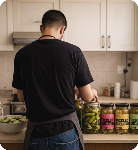 Meet the heart and hands behind The Pickle Shop. A true foodie at heart, he turned his love for experimenting into a mission to make pickles that are anything but ordinary. From taste-testing late into the night to finding that perfect spice balance, he’s determined to make every bite a flavor-packed adventure.